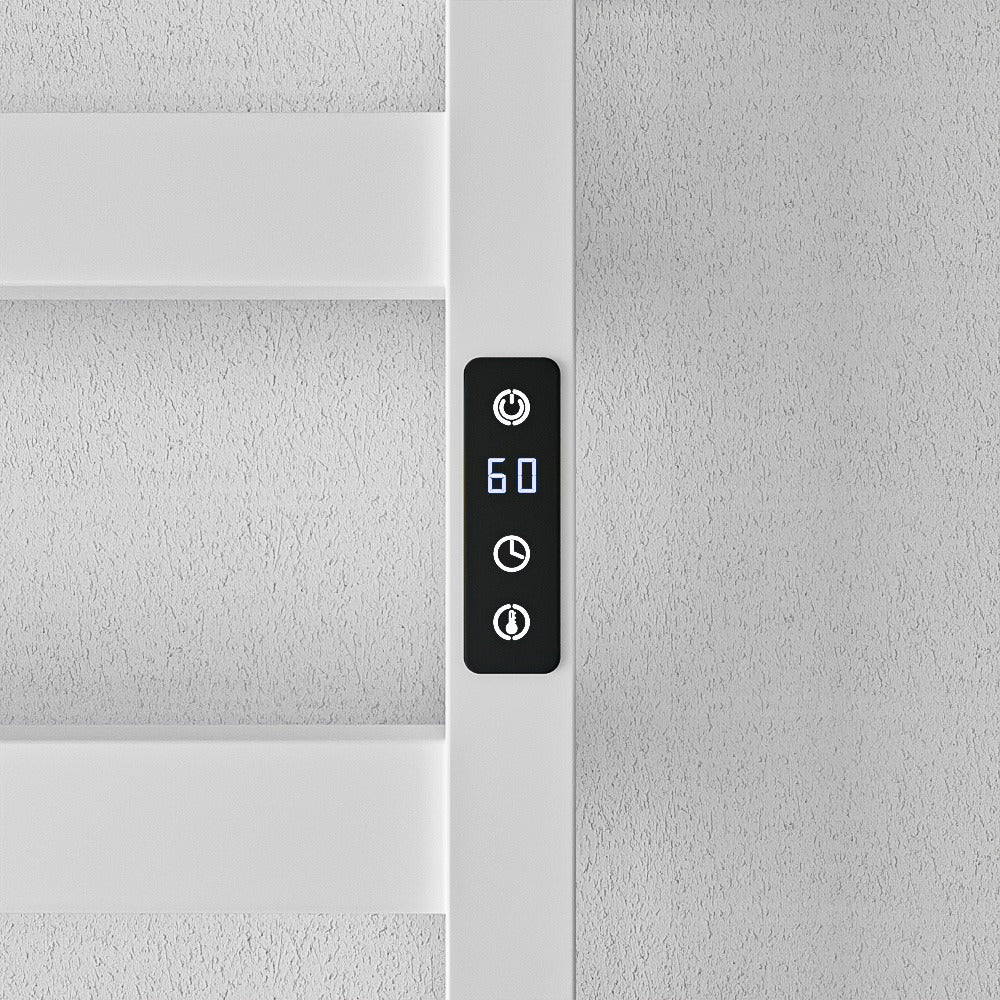 Der Handtuchtrockner verfügt über ein integriertes digitales Thermostat, mit dem sich die Temperatur in 5 °C-Schritten zwischen 30 °C und 60 °C individuell einstellen lässt. Eine gut lesbare Anzeige und einfache Bedienung machen die Steuerung besonders anwenderfreundlich. Ob sanft vorgewärmte Handtücher oder kraftvolles Durchheizen – die Anpassung an Ihre Bedürfnisse gelingt mühelos.